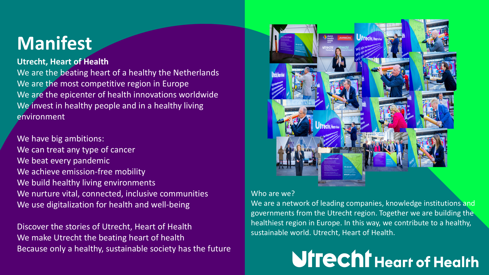 Utrecht, Heart of Health is the region where we work together towards a healthier, more sustainable future. Here, we develop solutions and innovations that enable us to live healthier lives physically, mentally and socially, in an environment that contributes to this.